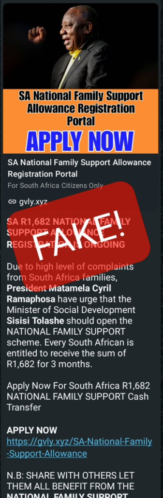 A viral post has been shared online claiming that South Africans can apply for a so-called R1,682 National Family Support Allowance through a third-party website.